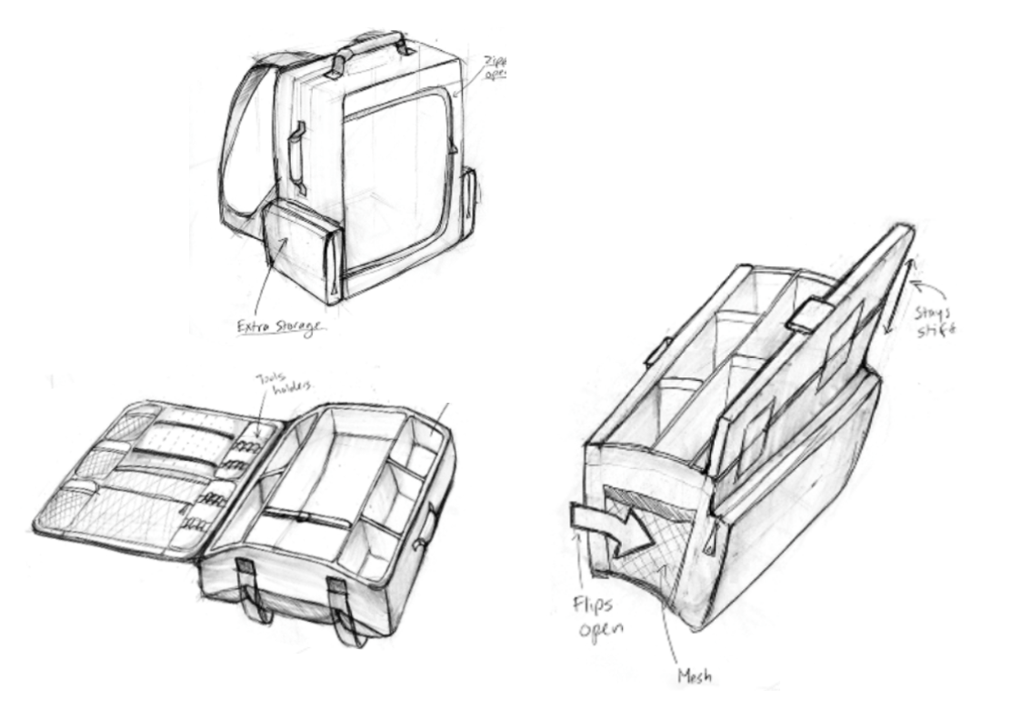 By bringing some of our sketched ideas into rough paper prototypes, we determined that we wanted a smaller cross-body bag that included multiple accessible compartments.