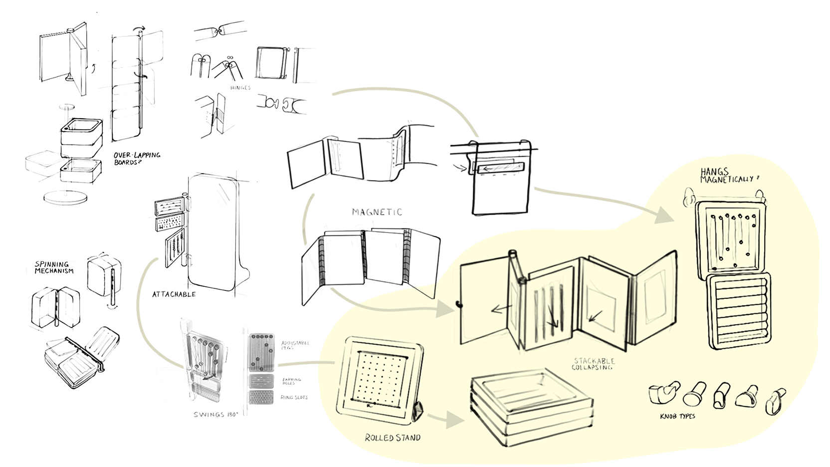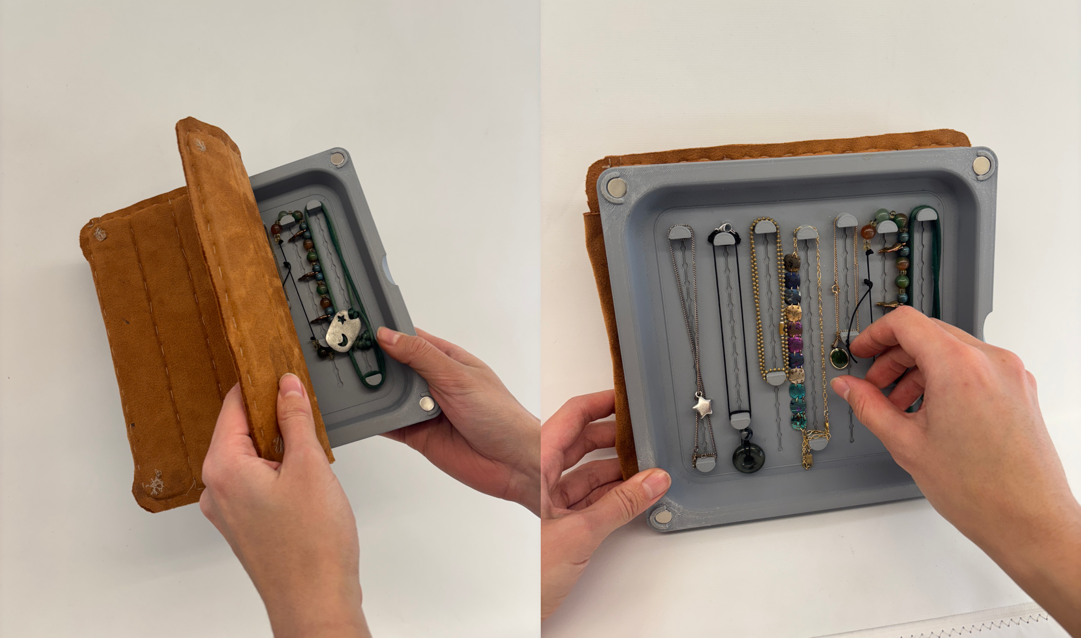 We ideated on using modular plates with multiple display modes, such as hanging and free-standing. We then experimented with how to secure necklaces, which often tangled.
