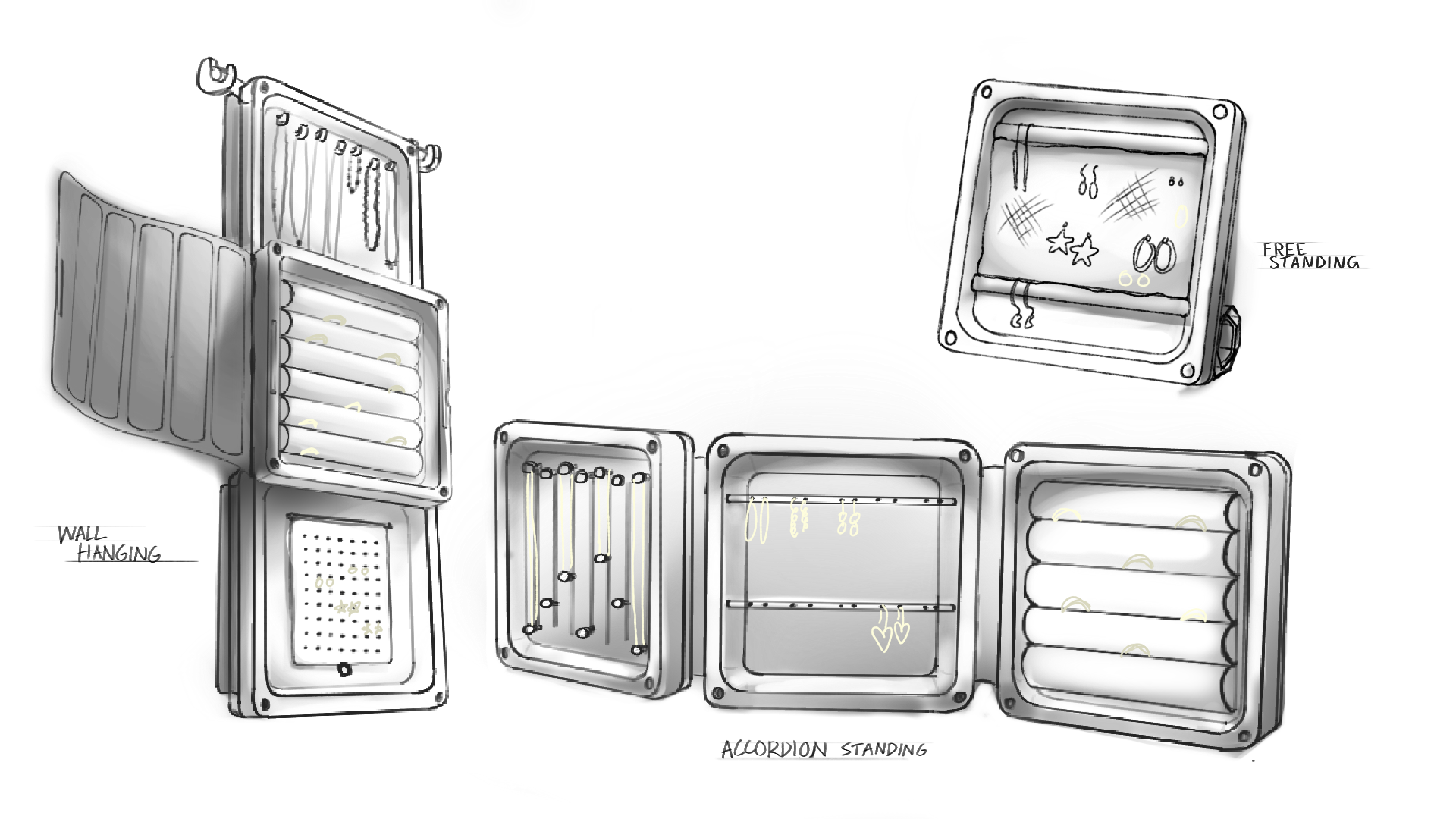 The final design has three plate designs for earrings, necklaces, and rings, with the ability to both hang and stand.